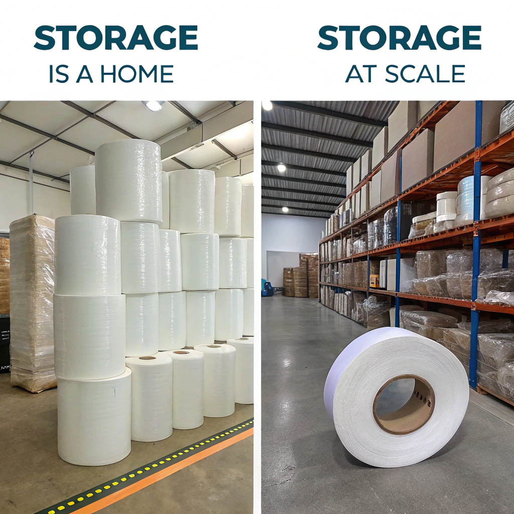 Yes, roll size strongly impacts storage space because larger diameters reduce carton efficiency and increase warehouse volume needs.